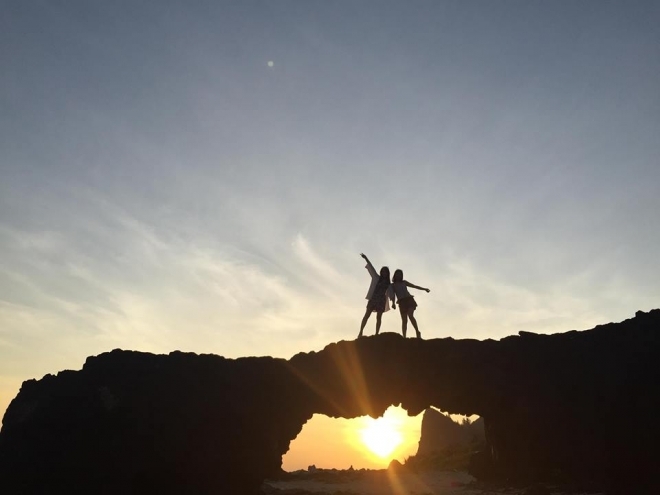 Ngày thứ hai, chúng mình quyết định dậy sớm để đón bình mình tại Cổng Tò Vò. Từ cầu cảng chính đi vào cổng chào của Lý Sơn, rẽ trái đi meo theo con đường nhỏ đến gần chùa Đục bạn sẽ thấy một mỏm đá nhỏ nằm sát dưới biển, đó chính là Cổng Tò Vò. Đúng 6h sáng, chúng mình có mặt tại đây và được tận mắt chứng kiến hình ảnh mặt trời ló dạng bừng sáng cả bầu trời, mang theo vô số những tia nắng ấm áp chào đón một ngày tươi đẹp.