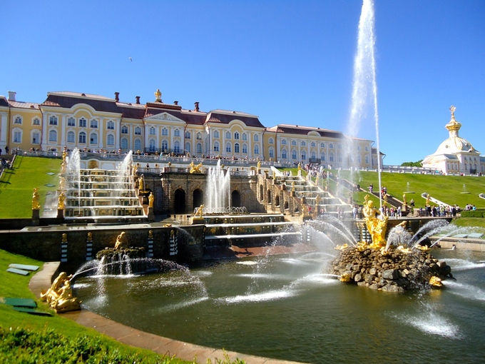 – Cung Điện Mùa Hè (Peterhof) – cách St Petersburg khoảng 30km – cung điện luôn tự hào với mỹ danh – Versailles của nước Nga. Nếu như St Petersburg là thành phố mang trong mình vẻ đẹp lộng lẫy, đồng bộ và cổ kính của các đô thị cổ châu Âu thì Cung Điện Mùa Hè chính là nơi kết tinh của sự lộng lẫy, quý phái và sa hoa đó. Tọa lạc trên một vùng đất rộng hơn 1000 hecta hướng ra vịnh Phần Lan, với những dinh thự nguy nga, vườn ngự uyển rộng lớn, lại được tô điểm bằng những tượng đồng hình nhân mạ vàng sáng bóng trong các huyền thoại Hy Lạp cùng những suối nước nhân tạo tuyệtđẹp, Peterhof đã làm xao xuyến bao du khách khi đến thăm mảnh đất này. Đây chính là nơi nghỉ ngơi mùa hè của các triều đại Nga hoàng, thành phố của các cung điện, công viên và đài phun nước. Quý khách tham quan quần thể kiến trúc nơi đây Vườn Hạ,Vườn Thượng, với 140 đài phun nước và 37 tượng mạ vàng.