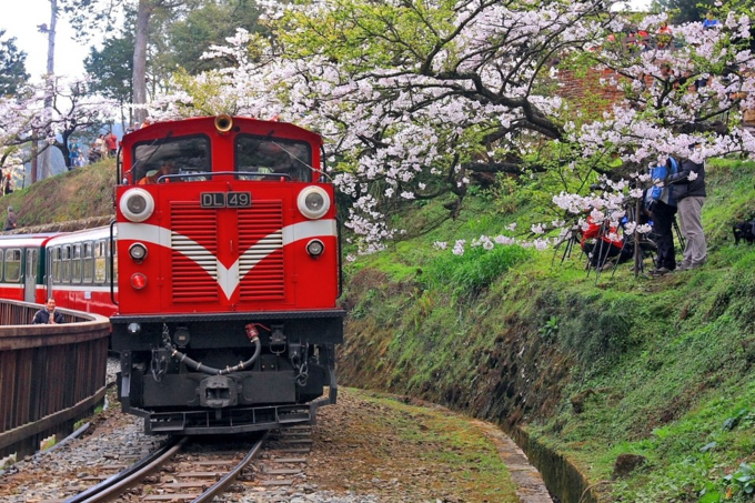Alishan hay còn gọi là A Lý Sơn thuộc thành phố Gia Nghĩa, miền Trung Đài Loan được mệnh danh là nơi đáng để check in nhất hòn đảo này. Dãy núi được biết tới với cung đường tàu hoả chạy trên đường ray cổ, toa tàu sơn màu đỏ, len lỏi qua khu rừng huyền ảo. Nó cũng được bình chọn là một trong 10 cung đường sắt lãng mạn nhất thế giới. Du lịch Đài Loan vào mùa xuân, bạn sẽ có cơ hội chiêm ngưỡng hàng cây anh đào yoshino nở rực rỡ, ôm trọn lấy cảnh sắc nơi này.
